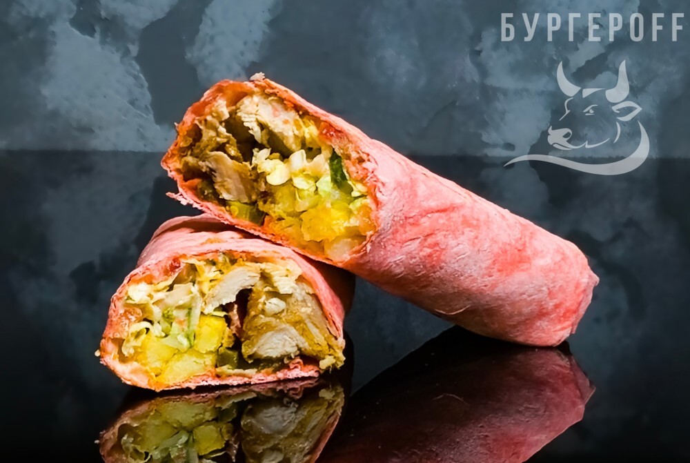 Лаваш, Курица жареная, Бургер соус, Соус острый, Халапеньо, Картофель фри, Салат для шаурмы